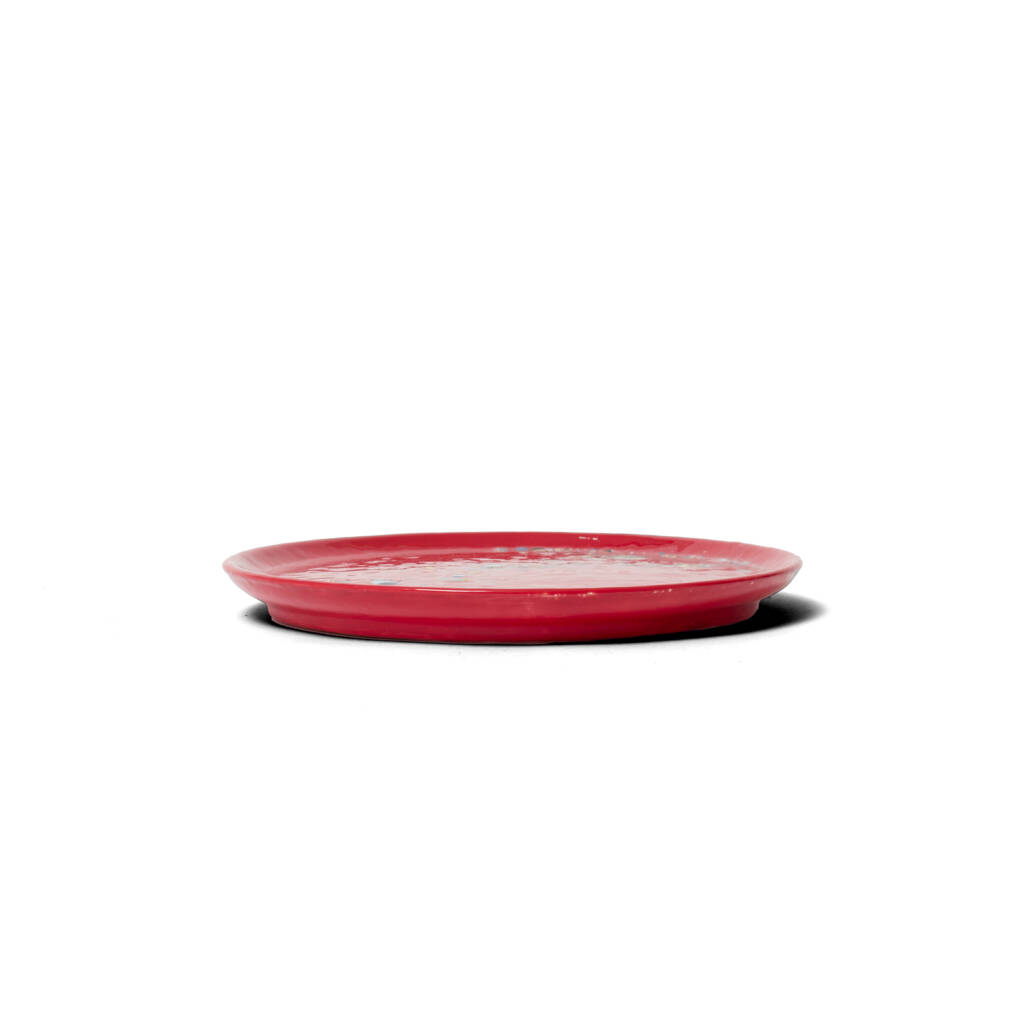 Handgemaakt rood keramisch ontbijtbord (20 cm) met subtiele glitter. Donkerrood, feestelijk en ideaal voor ontbijt of lunch. Slechts €6,95.